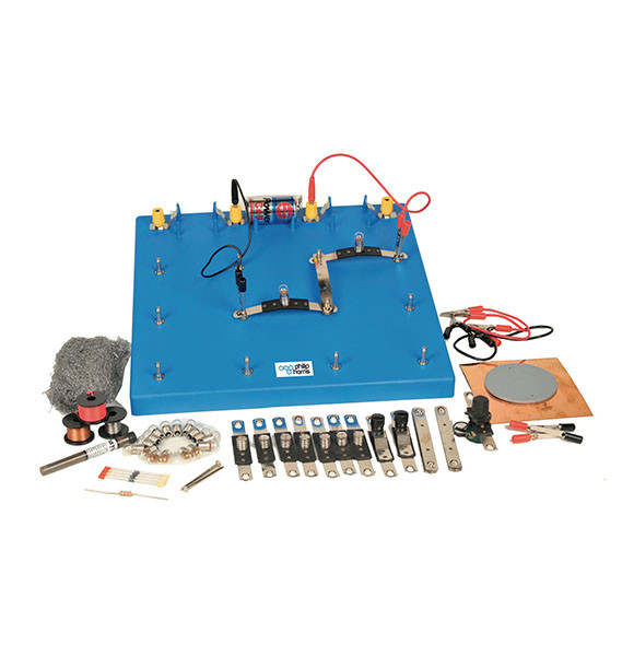 Worcester Circuit Board consists of a baseboard, terminals, a set of metal connection pillars and a number of clip-on flexible connection strips and accessory units, allowing a variety of circuits to be constructed quickly and easily. Phosphor-bronze connection strips are so designed that when flexed a little they are easily slipped over the pegs where their natural spring holds them in position and ensures a good electrical contact.
