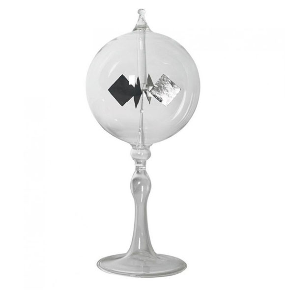 A Crookes radiometer consists of a glass bulb from which most of the air has been removed, thereby creating a partial vacuum, and a rotor that is mounted on a vertical support inside the bulb. The rotor bears four light, horizontal arms mounted at right angles. The Crookes radiometer consists of an airtight glass bulb containing a partial vacuum, with a set of vanes which are mounted on a spindle inside
