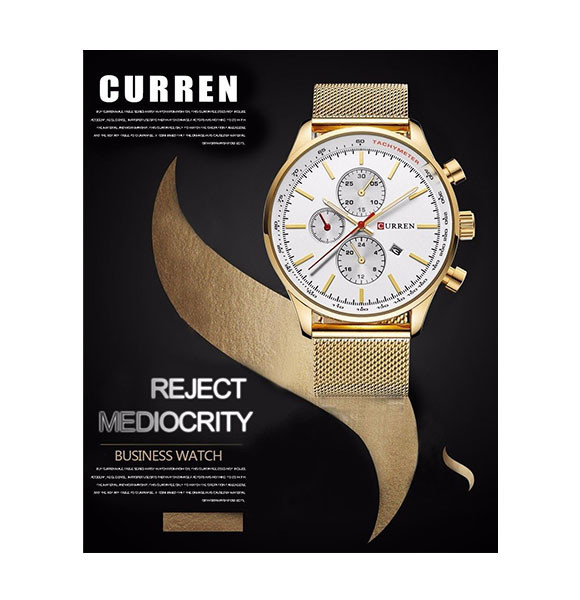 CURREN 8227 Business Men Quartz Watch with Decorative Sub-dial (Gold strap, white surface)