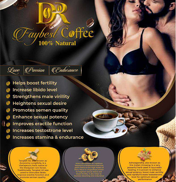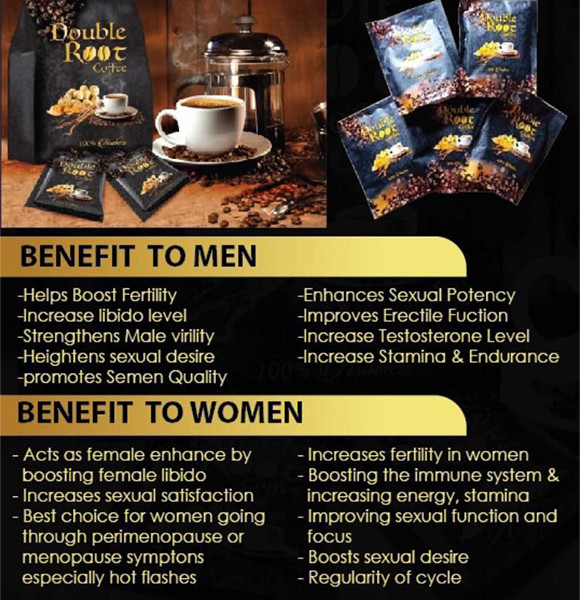 Double Root Coffee Boost Immunity, Increases Testosterone Level, Helps Boost Fertility, Increases Stamina in men & Endurance Acts as female enhancement and balances hormonal imbalance Helps women going through perimenopause or menopause symptoms especially hot flashes Increase fertility in women Boosts the immune system and increasing energy, stamina Regularity of cycle in women. Arabica Coffee Powder Non-Diary Creamer Ashwagandha extract Tongkai Ali extract Maca extract Sucralose