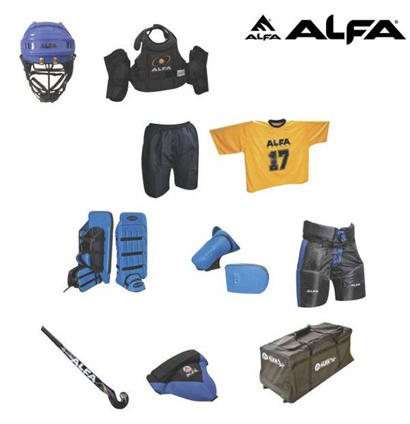Hockey standard kit includes chest with arm guard, shorts, leg guard and kicker, abdominal guard, goalie helmet, goalie gloves, over shirt, over short and goalie bag with wheel.