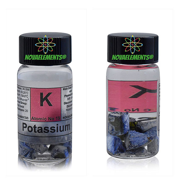 Potassium is a chemical element with the symbol K and atomic number 19. Potassium is a silvery-white metal that is soft enough to be cut with a knife with little force. Potassium metal reacts rapidly with atmospheric oxygen to form flaky white potassium peroxide in only seconds of exposure.